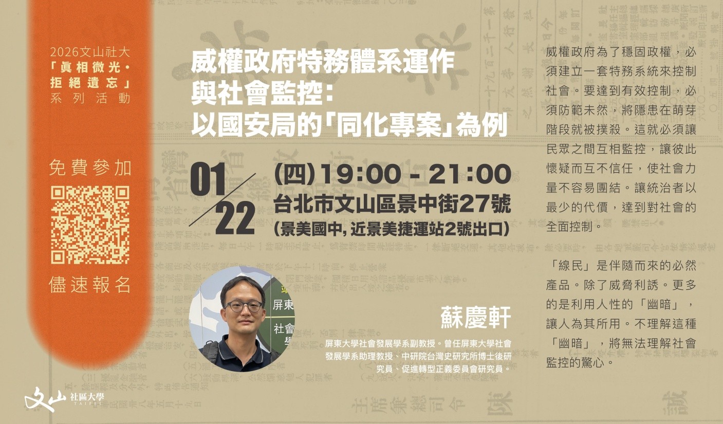 ※講題:威權政府特務體系運作與社會監控:以國安局的「同化專案」為例