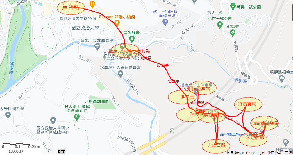1.政大校門口(起點)->石燈籠遺跡(指南路二段119巷)->新、舊朝山之路所形成的Y字路口(指南路二段197巷口)與消失的涼亭