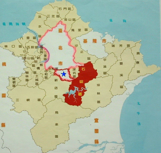 圖一:文山區在台北市的最南端(藍色星號所在的位置)。順時針依序與深坑、石碇、新店、中和、永和為界。