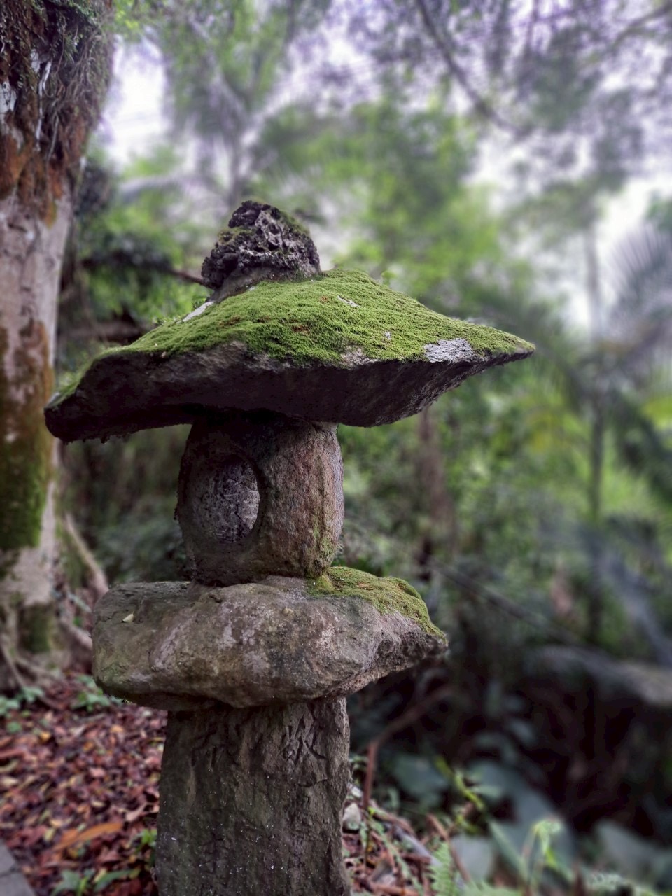(2)這種長竿身造型的石燈籠,在指南宮參道上數量最多。其由來是日本皇室曾仿照京都平安神宮中門所立石燈籠的樣式,製作二十七座,從日本運來臺灣敬獻於臺灣神社,日後流行於臺灣。