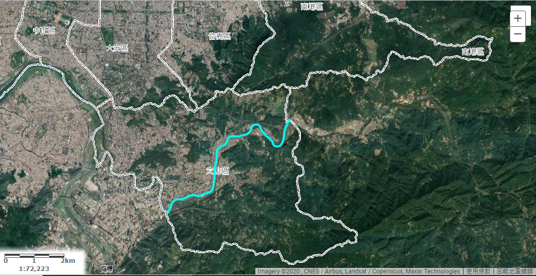 圖二:文山區北有南港山系,南有二格山系。景美溪(圖中藍色線條)貫穿其間,將文山區一分為二,左岸的部分稱二格山次分區,這裹有90%是山。我們現在在景美溪左岸。