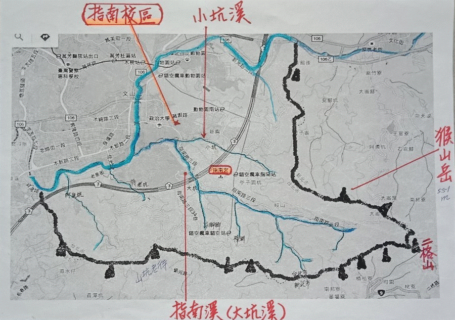 圖三:找出指南宮、指南溪、小坑溪與猴山岳的位置。瞭解指南宮位於指南溪與小坑溪之間,指南宮與猴山之間的關係。