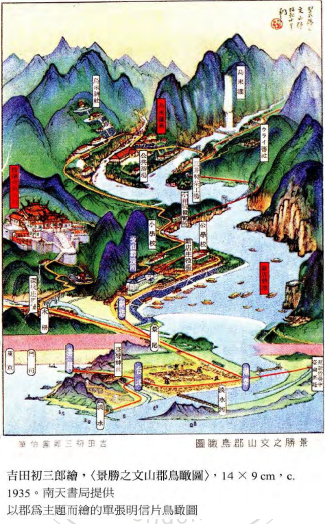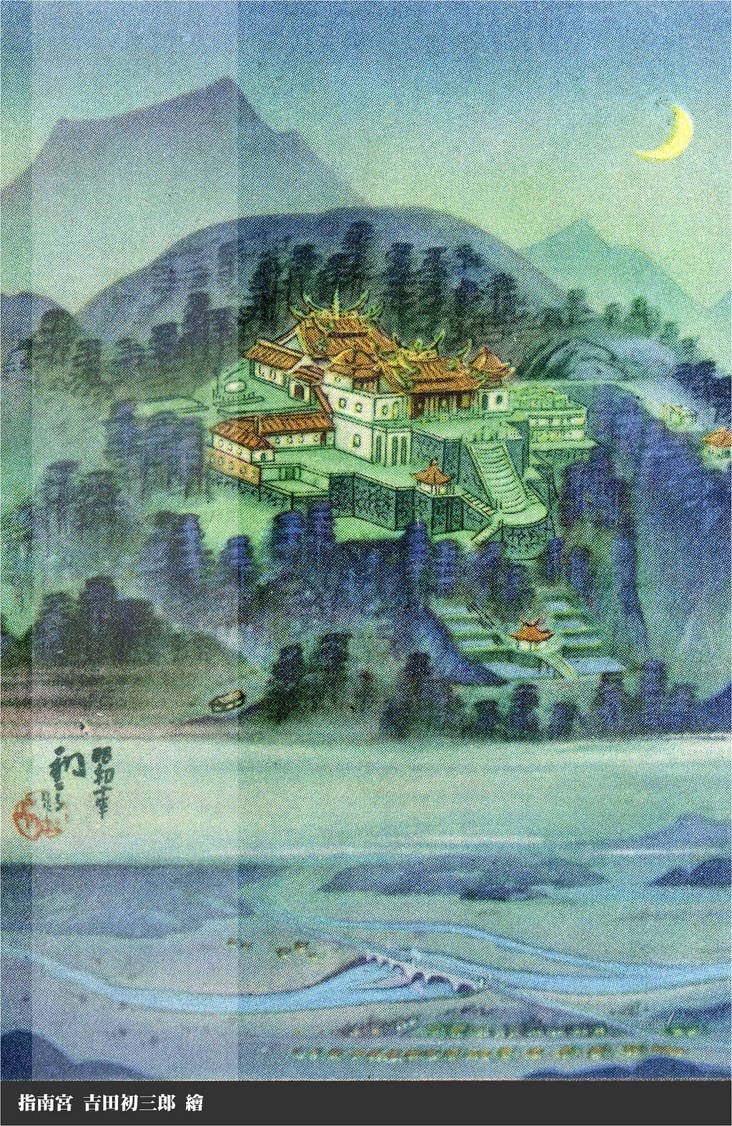 2.觀察吉田初三郎在1935年(昭和十年)所畫的〈指南宮〉和〈景勝之文山郡鳥瞰圖〉: