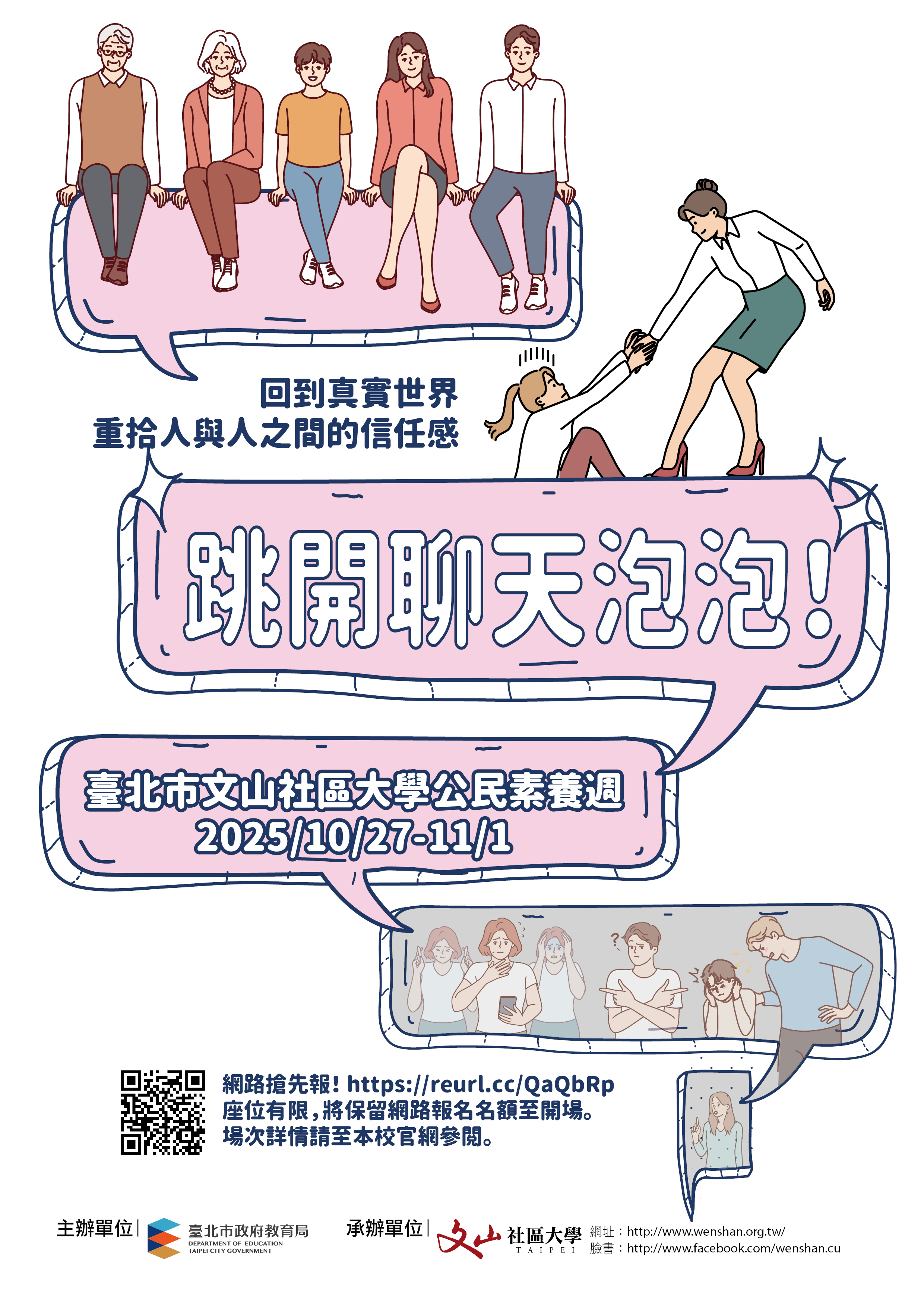 ※隱私條款:公民週所有活動我們都會攝影,報名參加活動,視同同意社大使用含有個人肖像的相片與影音。如果不同意,請在活動舉辦現場告知社大工作人員。