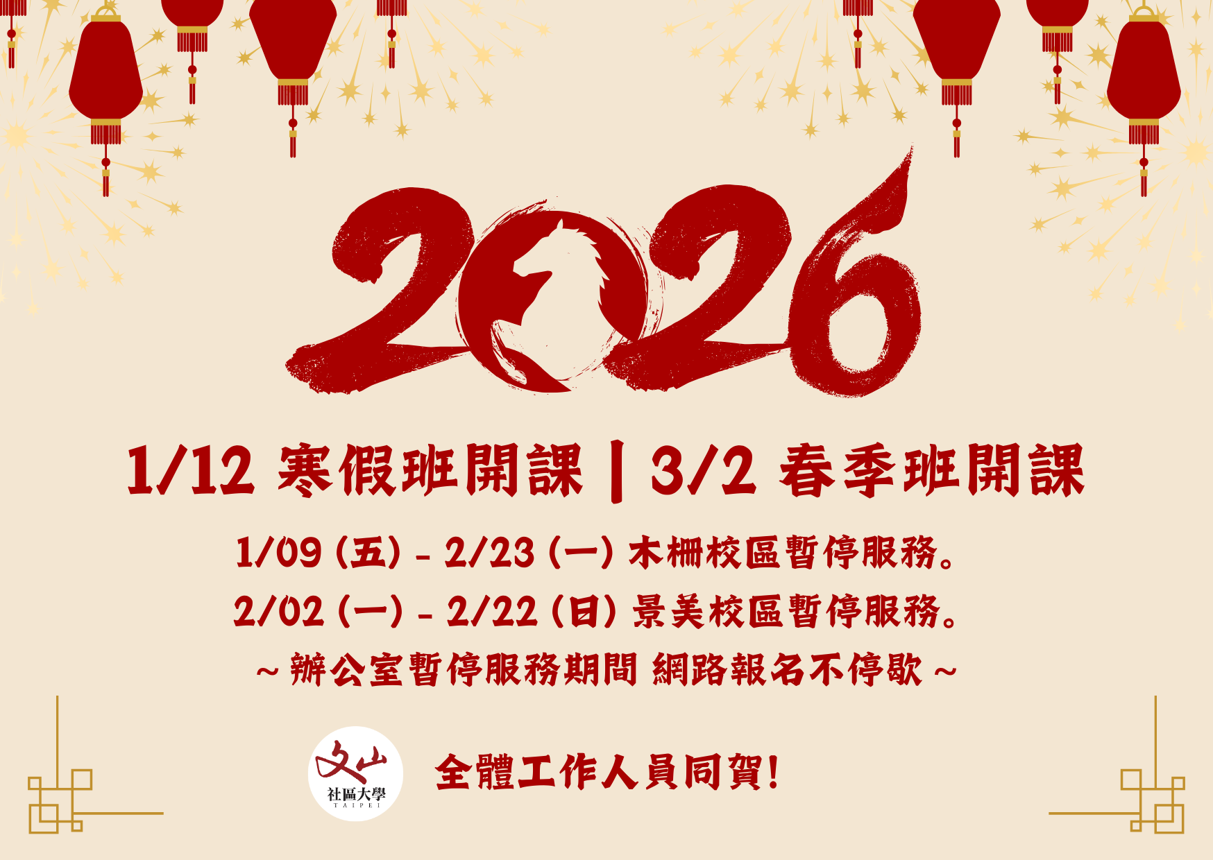 2/02 (一) - 2/22 (日)|辦公室寒假,全時段暫停服務。
