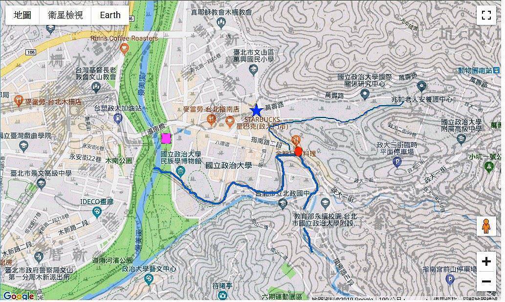 1.政大校門口(起點)->石燈籠遺跡(指南路二段119巷)->新、舊朝山之路所形成的Y字路口(指南路二段197巷口)與消失的涼亭